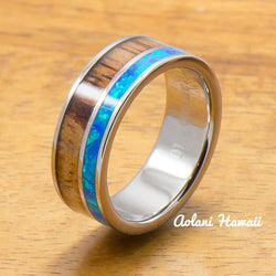 - Titanium Ring with Opal and Hawaiian Koa Wood Inlay (8mm width, Flat Style)