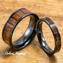 - Wedding Band Set of Ceramic Rings with Hawaiian Koa Wood Inlay (4mm & 6mm width, Flat Style )