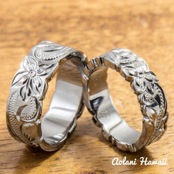 - Set of Traditional Hawaiian Hand Engraved Sterling Silver Ring With Black Rhodium Coating(6mm & 8mm width, Flat Style)