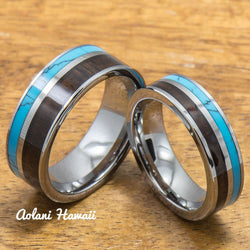 - Turquoise Tungsten Rings Set with Dark Koa Wood Inlay (6mm & 8mm width, Flat Style)
