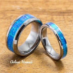 - Wedding Band Set of Tungsten Rings with Opal Inlay (8mm & 4mm width, Flat Style)