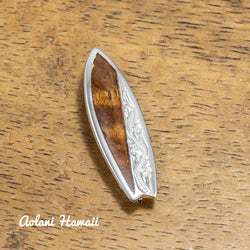 - Koa Wood Surfboard Pendant Handmade with 925 Sterling Silver (8.5mm x 27mm FREE Stainless Chain Included)